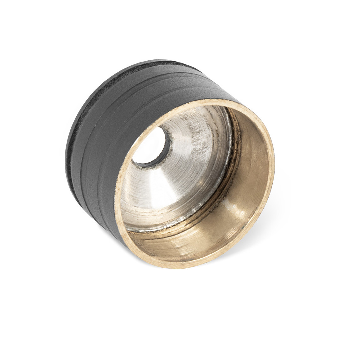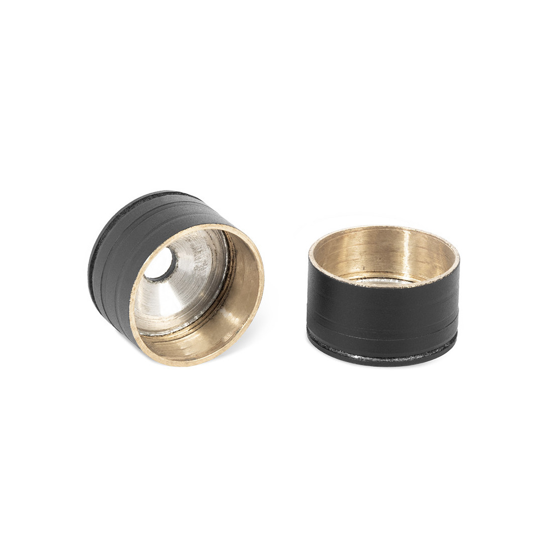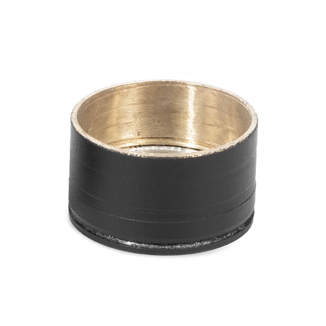 Soporte lateral para tubo redondo de armario con cuerpo de zamak y camisa interior metálica color latón/bronze. La gama se presenta en acabado negro y se fabrica para distintos diámetros de tubo, con variantes para 12, 16, 19 y 25 mm. Su geometría es de casquillo o buje cilíndrico de ajuste, con forma corta, borde superior e inferior ligeramente rebajados e interior mecanizado torneado.