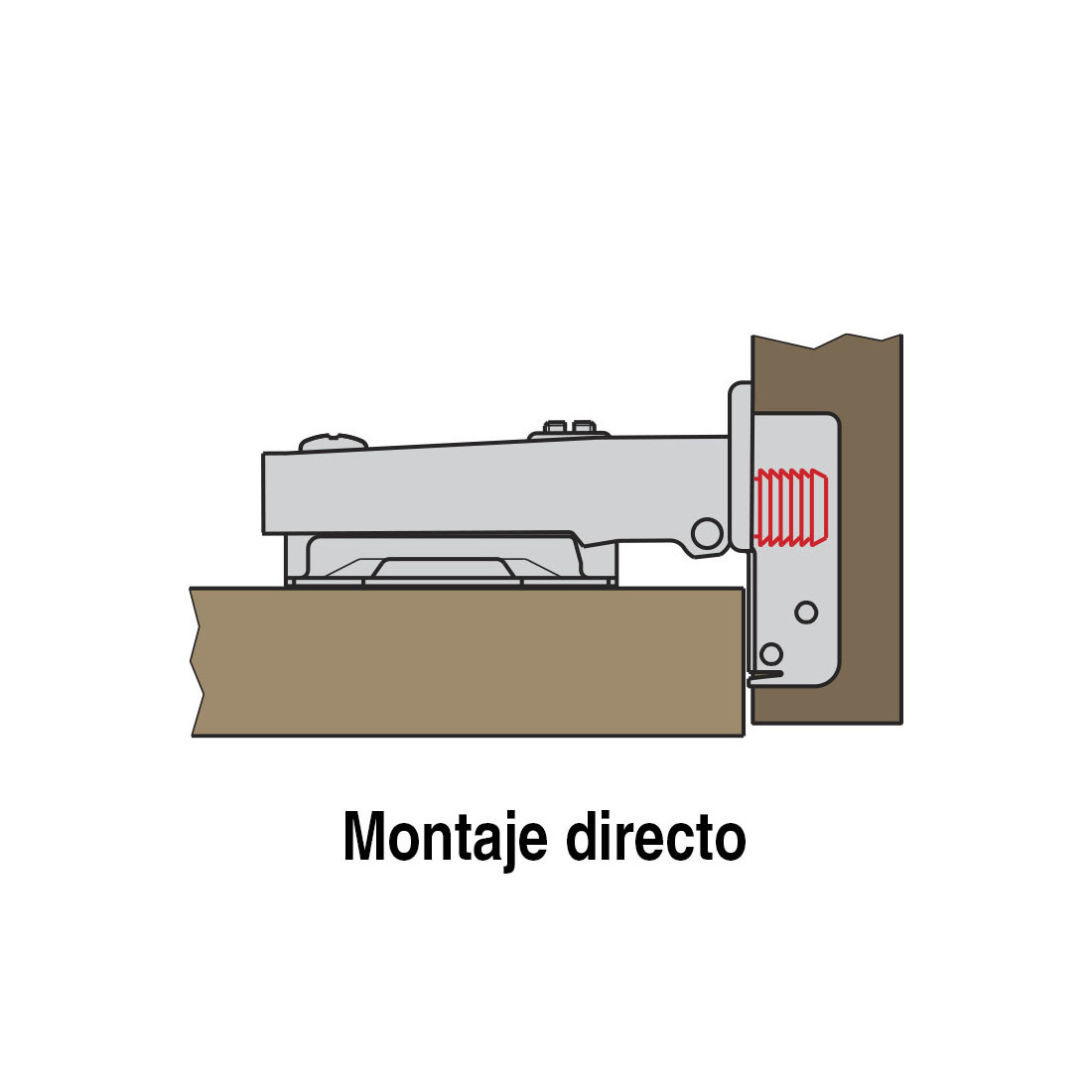 Tiene un diámetro de cazoleta de 35 mm y una profundidad de 10 mm (MD10). Esta bisagra se adapta a una amplia variedad de frentes de puerta. El sistema RT (Retención Total) garantiza que la puerta se mantenga cerrada sin necesidad de imanes, muelles externos ni otros accesorios de cierre.