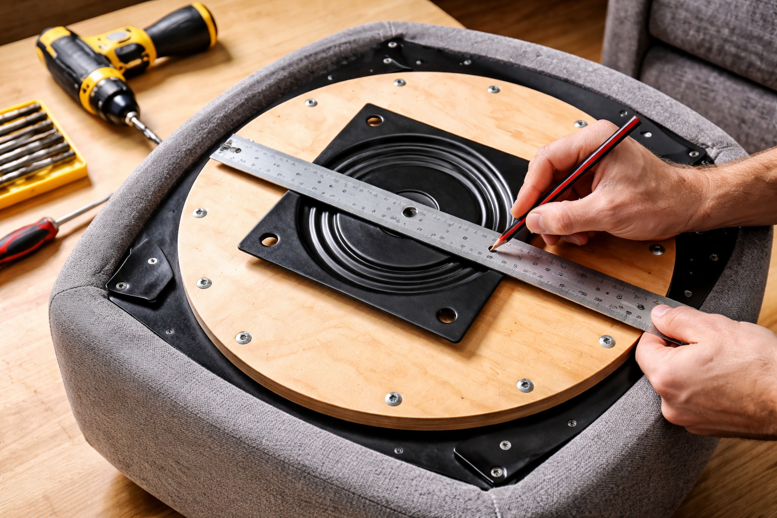 Un plato giratorio es un herraje de acero con rodamientos que permite un giro suave sin mover el mueble. Se monta entre la base del asiento y su estructura, y soporta el peso durante el giro.