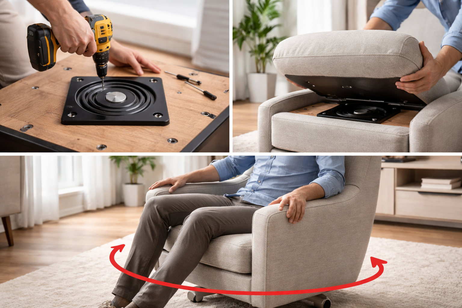 Un plato giratorio convierte una silla o un sillón estático en un asiento que gira 360º. Es una mejora sencilla que aporta comodidad, accesibilidad y un uso más flexible del espacio.
