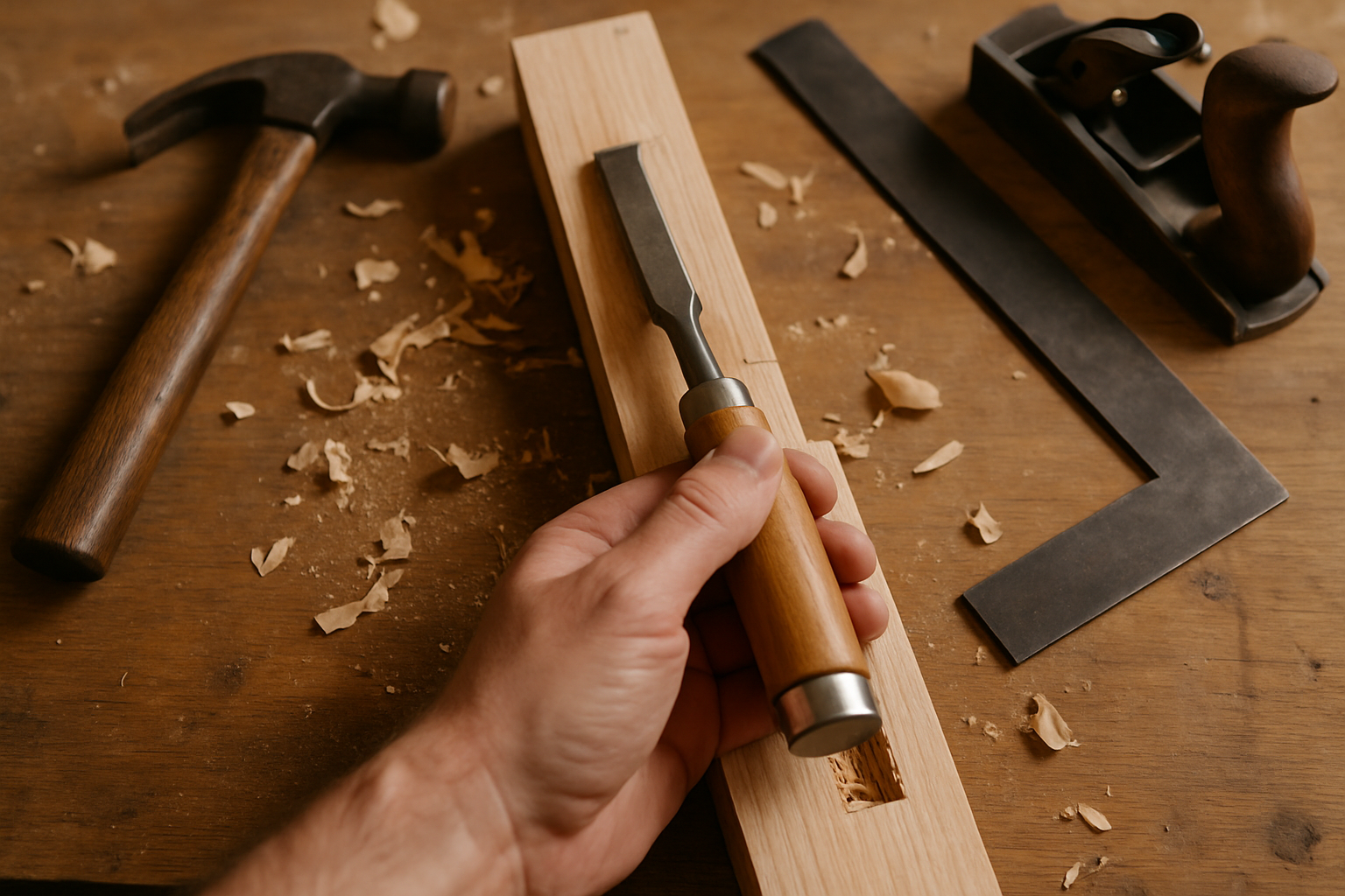 Nuestra recomendación es que siempre que sea posible uses un martillo de goma o maza de madera para golpear el formón y mantener el control del corte en todo momento.