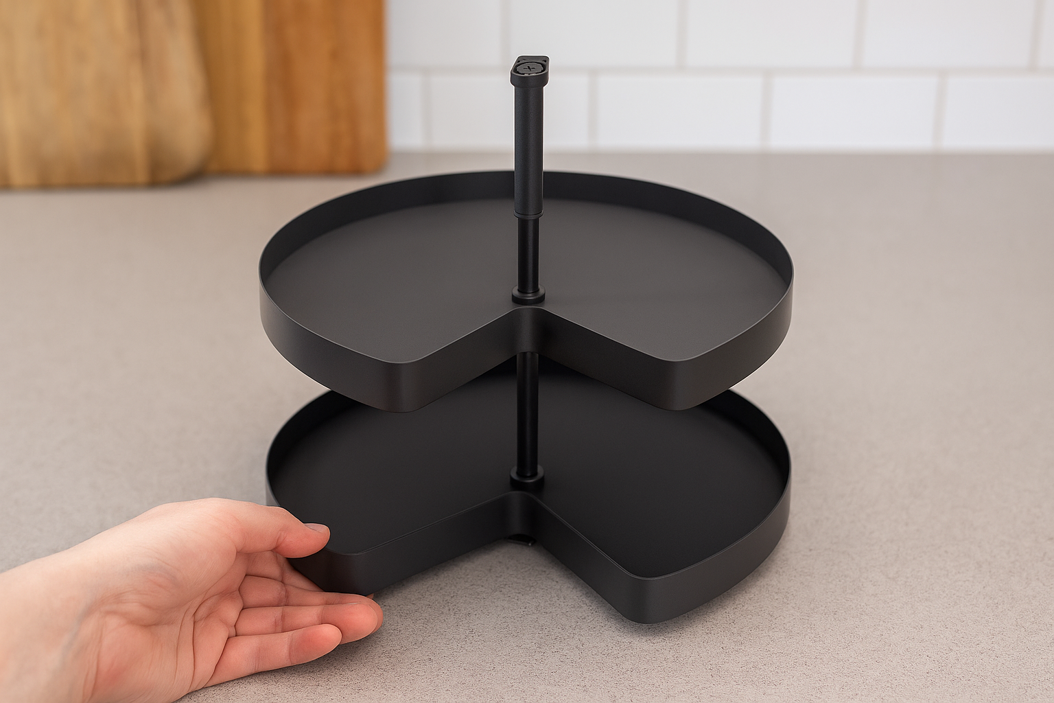 Los rinconeros extraíbles en forma de riñón aprovechan el espacio usando bandejas que, al abrir la puerta del armario, salen hacia fuera. Pueden ser en forma de riñón o media luna, lo que las hace muy prácticas porque ofrecen un acceso completo al contenido sin necesidad de hacer movimientos incómodos.