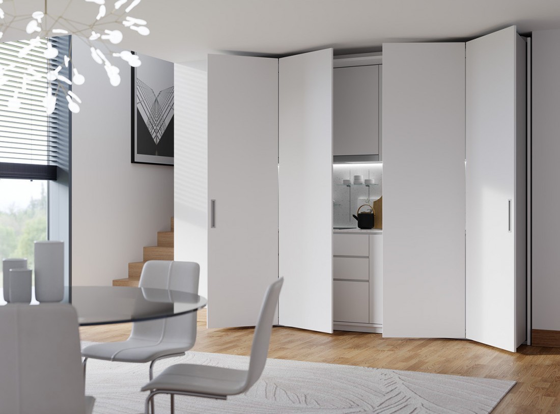 Una puerta escamoteable se desliza y se oculta dentro del mueble al abrirse, lo que permite un acceso total al interior. Este tipo de puerta destaca por su eficiencia en espacios reducidos y su estética integrada.