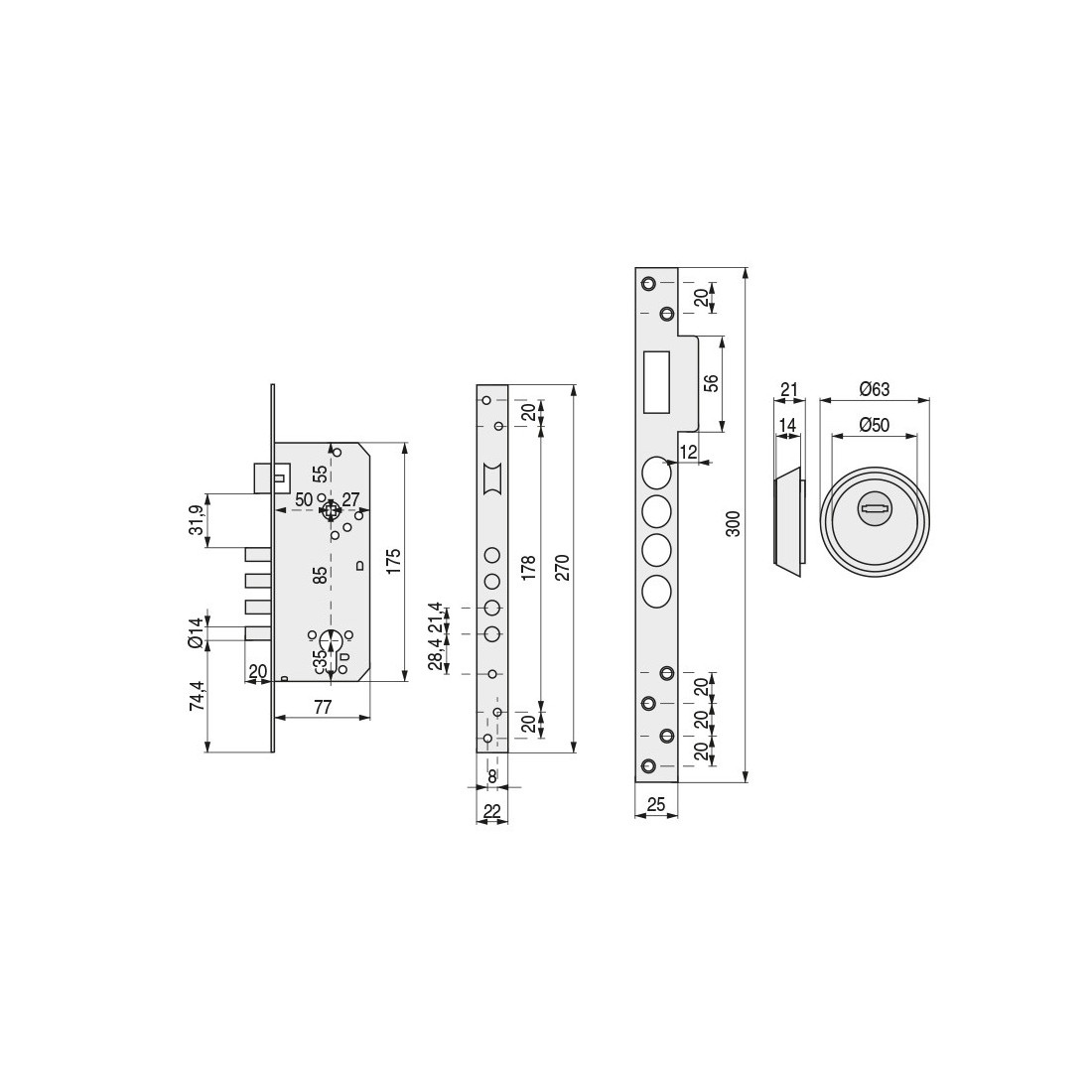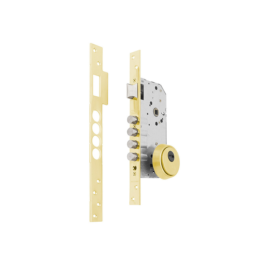 Equipada con 4 bulones de acero niquelado de Ø14 mm, esta cerradura garantiza una protección eficaz frente a intentos de forzado. Incluye escudo de seguridad E700L y cilindro T60.