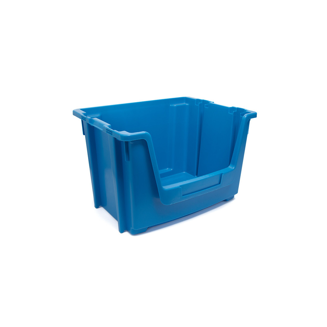 Gaveta apilable y encajable TAYG de polipropileno para almacenaje y picking. Tiene geometría rectangular abierta por la parte superior, pared frontal rebajada para el acceso al contenido, base cerrada y nervaduras laterales de refuerzo. El acabado es liso brillante y el color es azul.