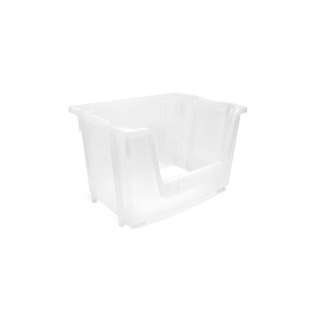 Es un contenedor abierto de plástico, con diseño apilable y encajable para almacenamiento y clasificación de materiales.