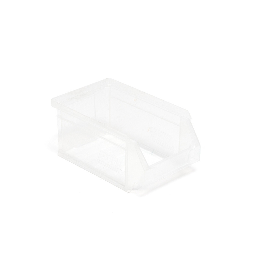 Gaveta apilable TAYG de plástico translúcido para almacenamiento, clasificación y organización de piezas en espacios de trabajo, almacenes o estanterías. Tiene formato rectangular, perfil bajo y estructura apilable.