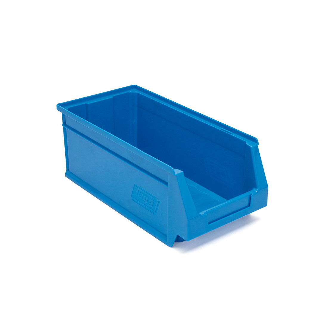 Gaveta apilable TAYG de plástico, en color azul, con capacidad de 4,8 litros y medidas exteriores de 336 x 160 x 130 mm. Se utiliza para almacenamiento y organización de piezas pequeñas en sistemas de gavetas apilables.