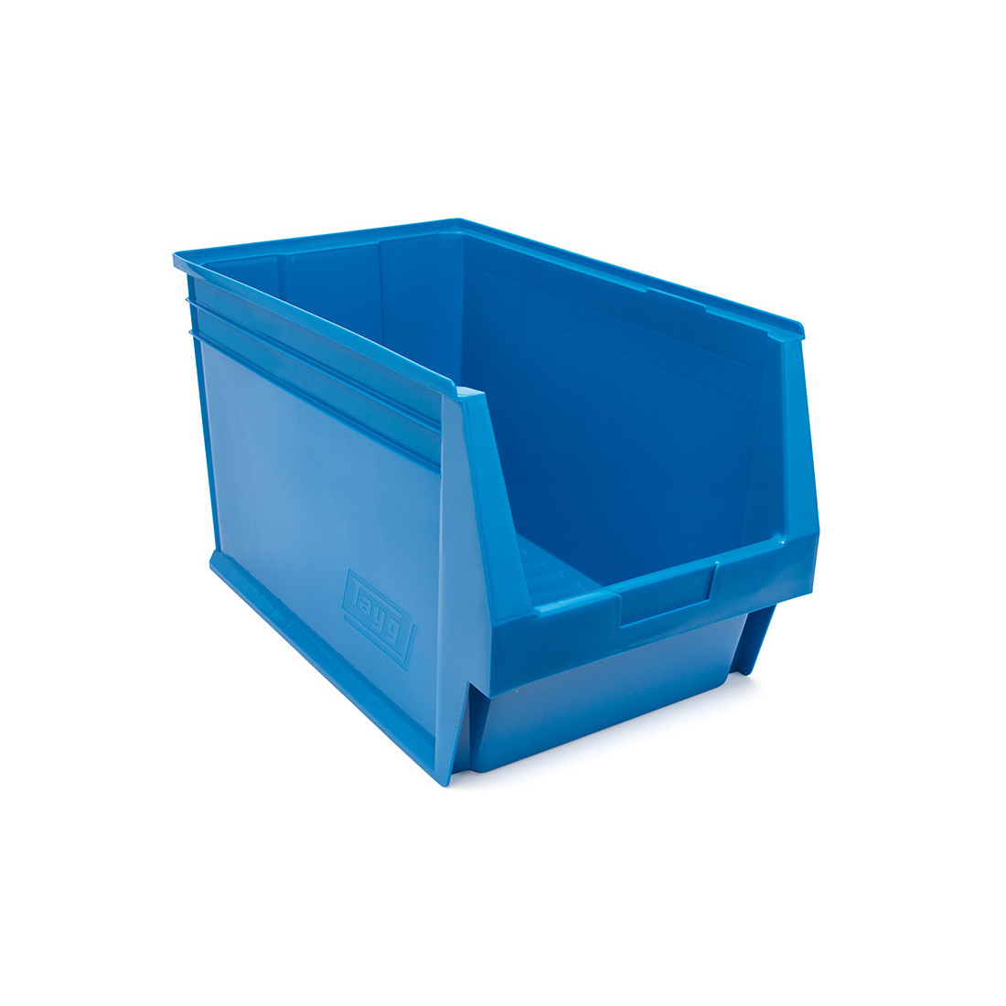 Gaveta apilable de plástico rígido para almacenamiento y organización de piezas en estanterías, bancos de trabajo y sistemas de clasificación manual. Presenta forma rectangular, frente rebajado para acceso al contenido y base cerrada con apoyos inferiores para apilado y estabilidad.