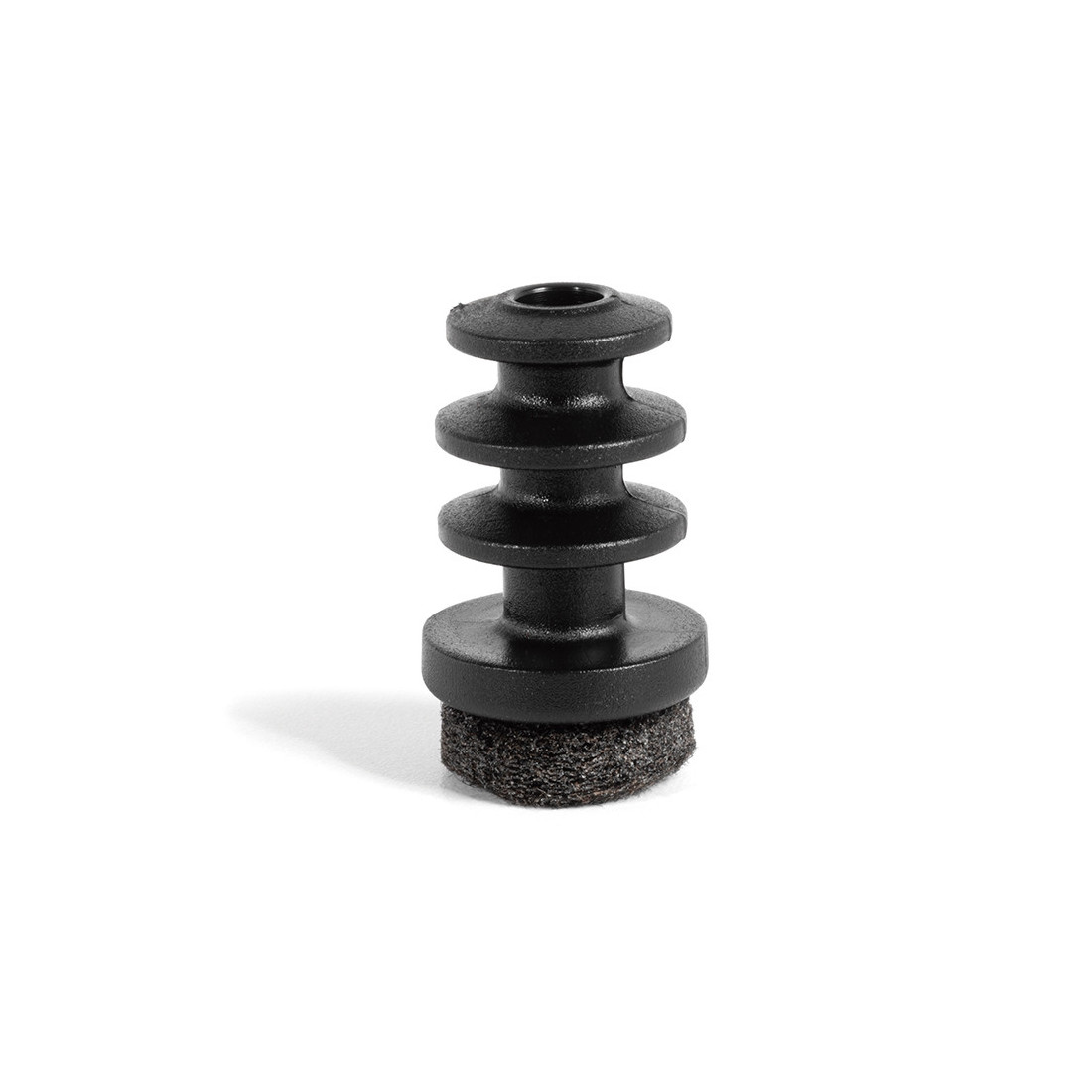 Contera redonda con fieltro Ø14 para inserción en tubo. Combina cuerpo de plástico negro y base de fieltro, con apoyo en contacto con la superficie y función de deslizamiento o protección del pavimento.