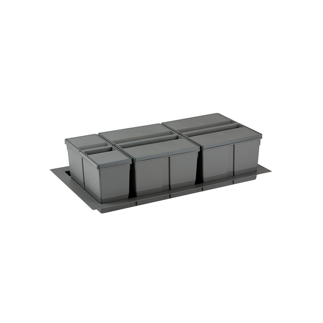 Es ideal para familias, cocinas de uso intensivo o proyectos de mobiliario donde interesa combinar dos fracciones con más volumen (por ejemplo orgánico y resto) y una tercera para envases o papel.