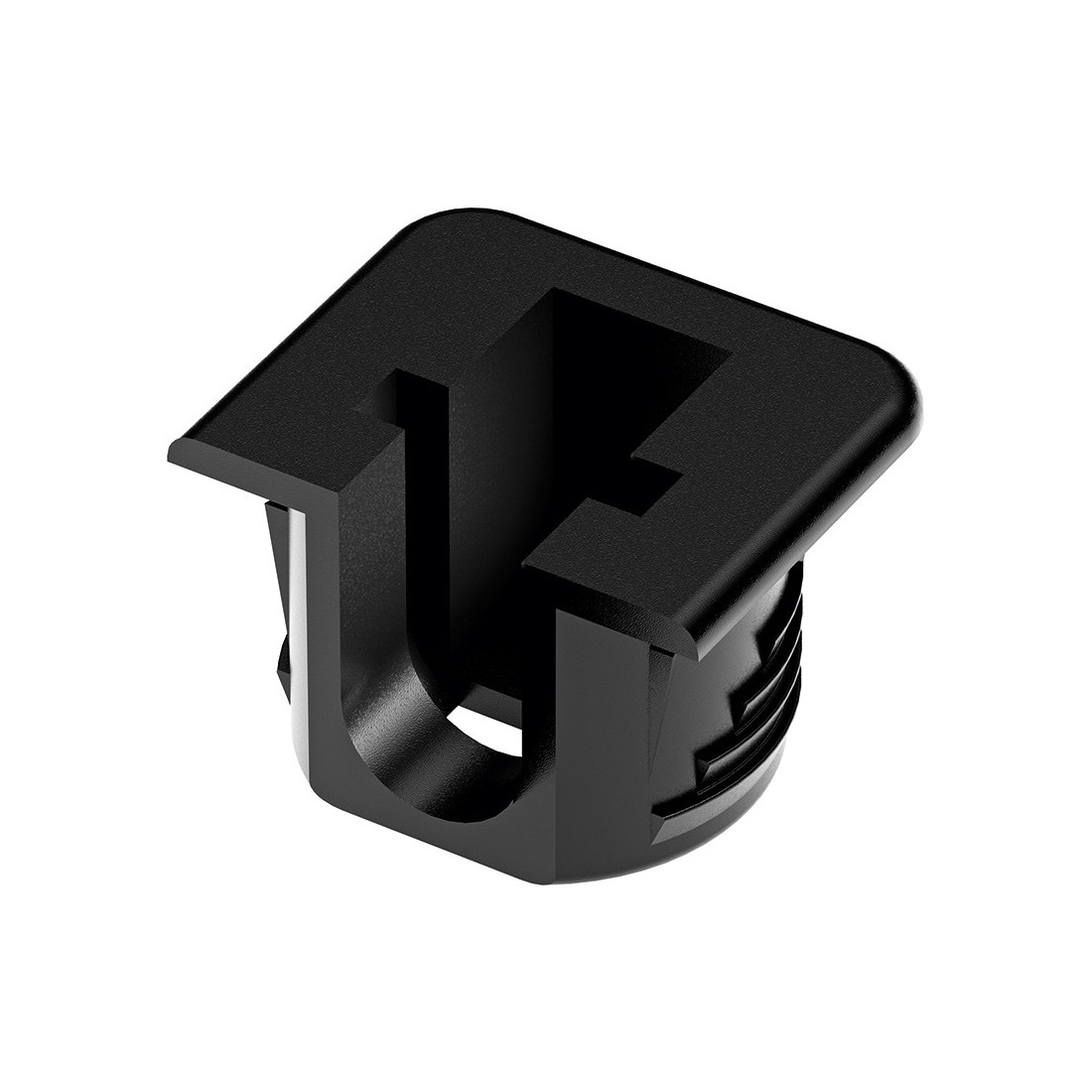 Soporte cazoleta de plástico negro Flipper para estantería ranurada de madera. Se utiliza en estantes con espesor mínimo de 16 mm y encaje mediante taladro de Ø15 mm. La pieza forma parte del sistema de soporte de la balda y se presenta en material plástico de color negro.