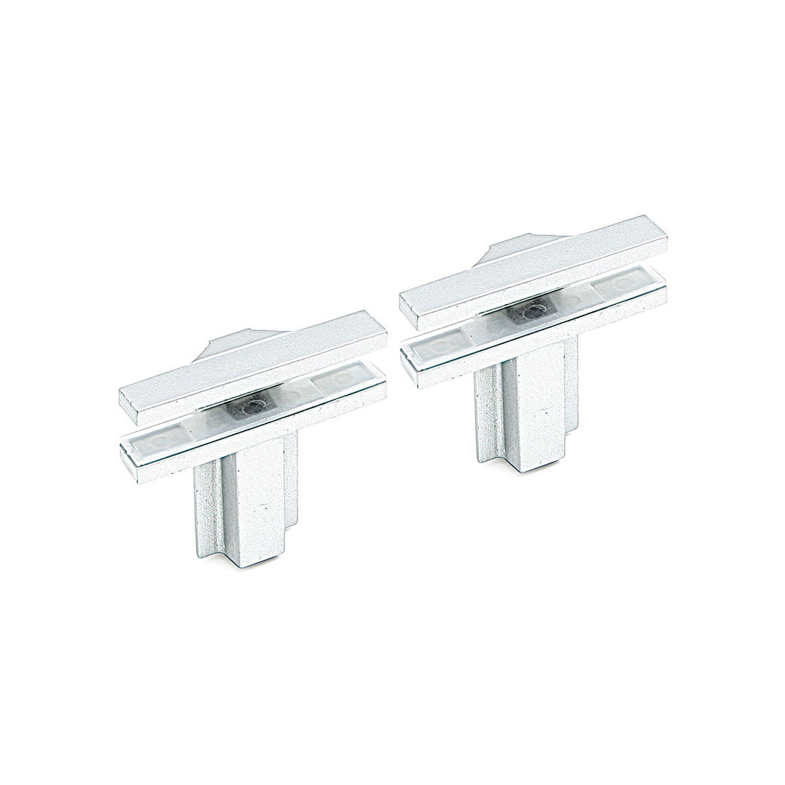 Juego de 2 soportes para estante en zamak, con fijación directa al perfil de estructura de aluminio KUADROSISTEM. Se utiliza para la sujeción de estantes de madera o cristal con un espesor de 3 a 25 mm. El sistema permite la instalación sin desmontar la estructura.