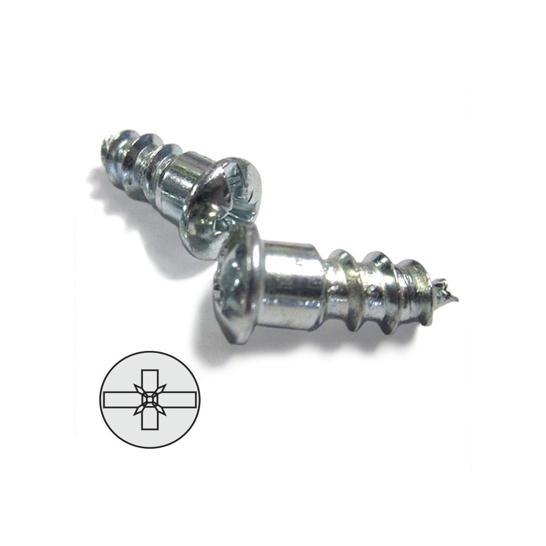 Es un tornillo de acero zincado para soporte cazoleta exéntrica, con punta y rosca gruesa.
