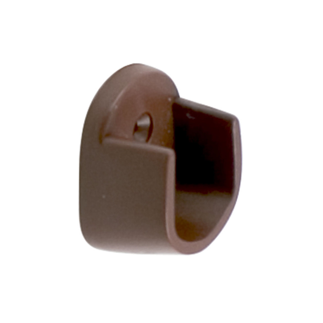 Soporte para tubo ovalado de plástico marrón con alojamiento semicircular y una perforación para fijación mediante tornillo. La pieza está fabricada en plástico y se utiliza como soporte, guía o casquillo de apoyo para tubo o varilla con encaje en el alojamiento.