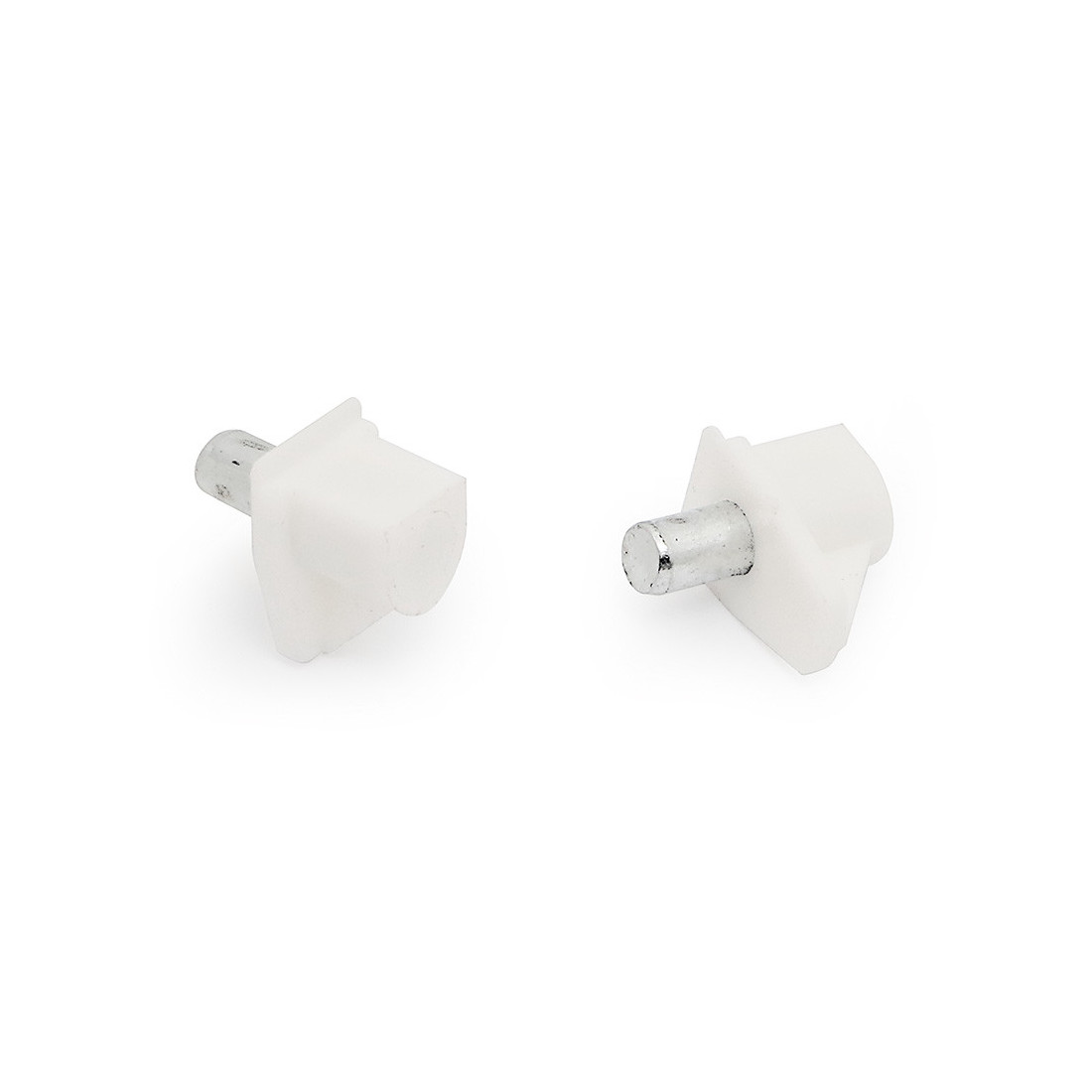 Requiere taladro previo de Ø5 mm en el estante. La espiga se introduce en el alojamiento y la presión mantiene la pieza en posición. El conjunto está planteado para montaje en estantes de 16 mm de espesor.