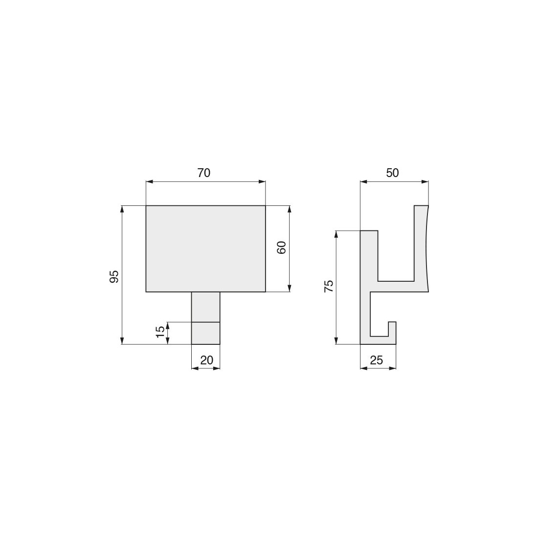 Las medidas indicadas son 70 mm de ancho frontal, 95 mm de alto total, 60 mm de altura útil, 50 mm de fondo y 20 mm de espesor de base.
