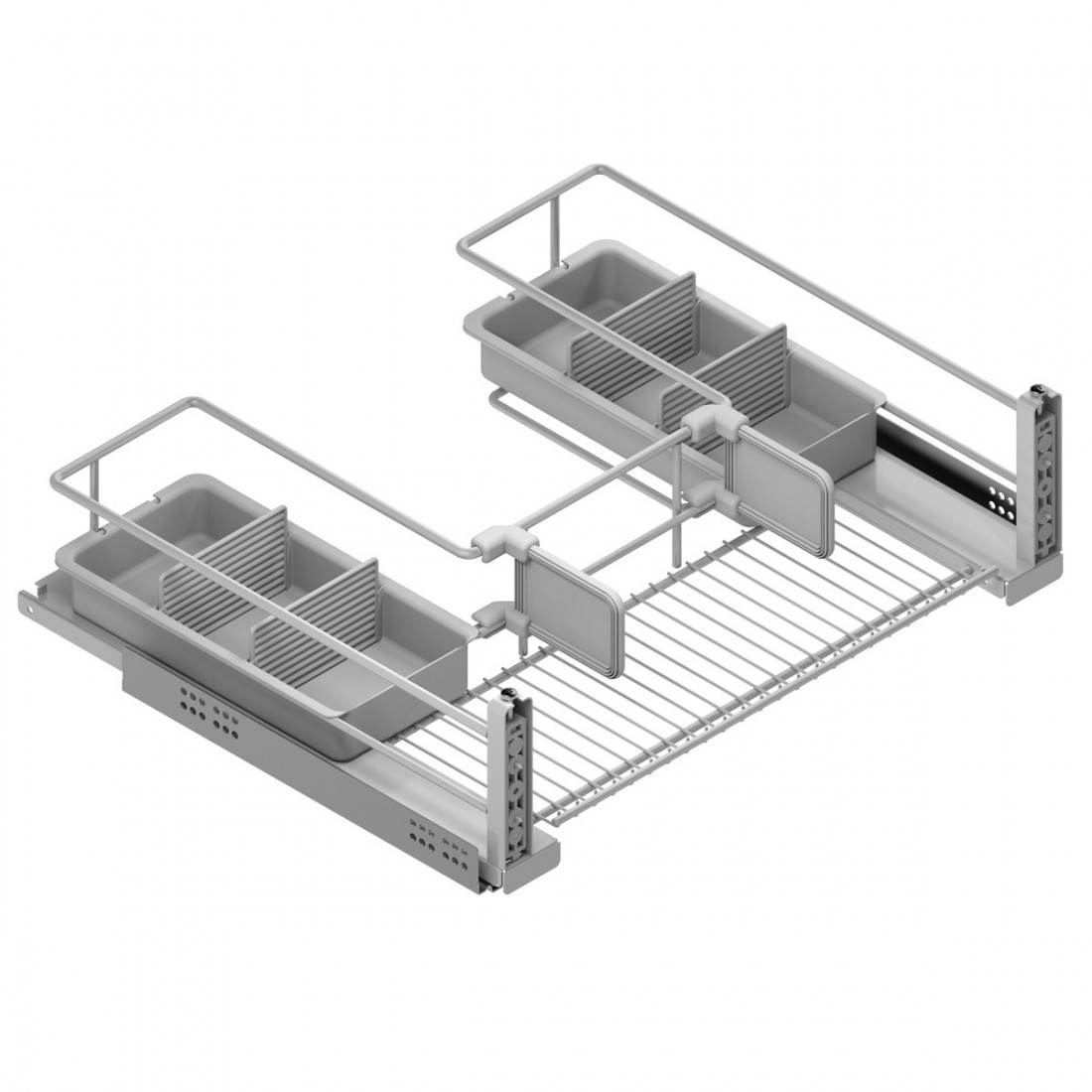 La instalación se realiza fijando las guías laterales al interior del mueble del fregadero. Posteriormente se coloca la estructura del cesto sobre las guías hasta que quede correctamente encajada. Una vez instalado, el sistema permite una extracción suave con cierre amortiguado para mayor comodidad.