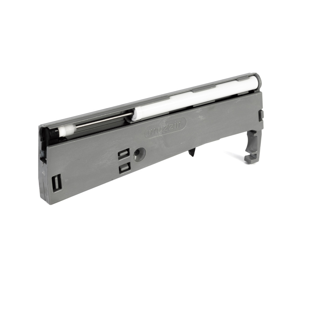 Su montaje se realiza directamente en la guía compatible, integrándose en el sistema sin modificar la estructura del mueble. Está disponible con descuento por volumen al comprar 500 unidades o más.