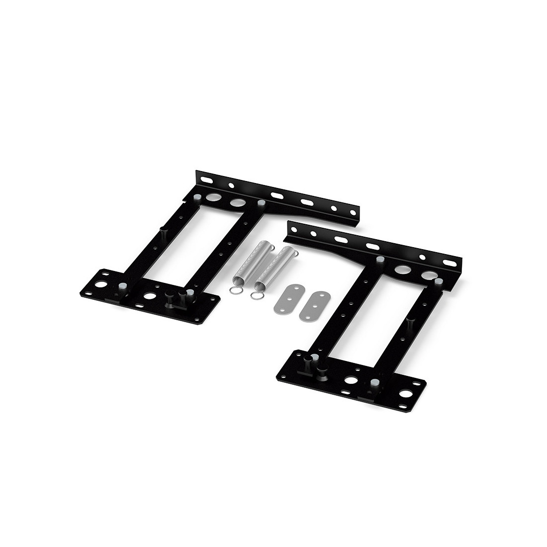 Se monta bajo el tablero de madera y requiere un diseño de mesa compatible con el sistema de apertura. El conjunto incorpora brazos articulados, placas perforadas y puntos de regulación para facilitar el atornillado y el ajuste durante el montaje.
