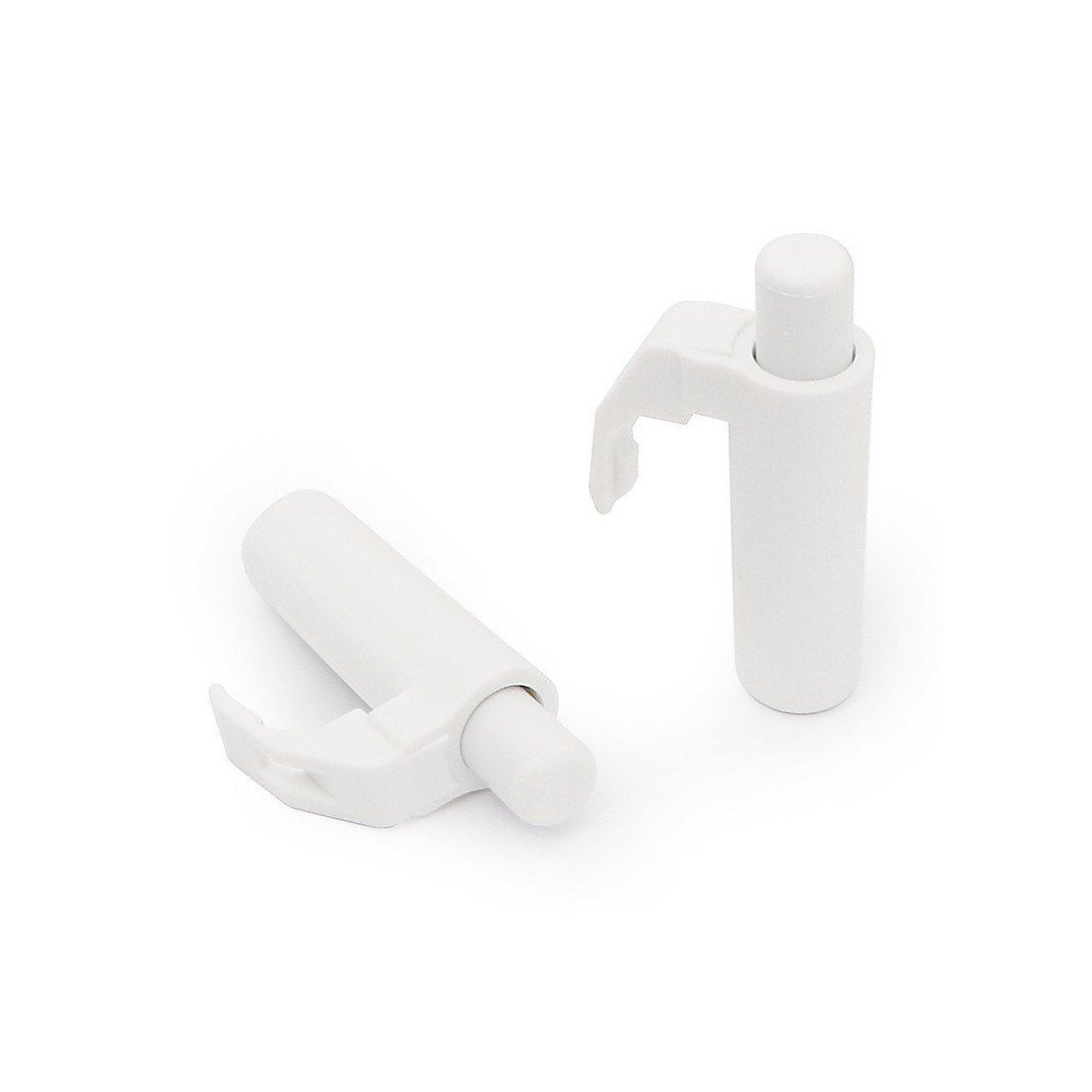 El cuerpo es de plástico con pulsador central visible y formato compacto. La pieza se utiliza como complemento del sistema de perchero abatible para suavizar el cierre y la maniobra de descenso.