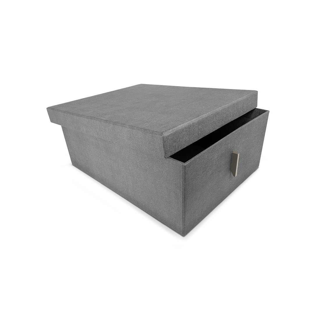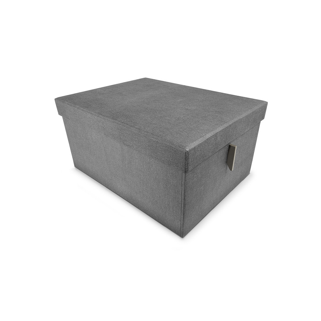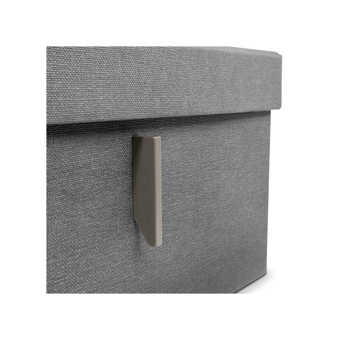 Caja de organización de armario textil para interior de armario y almacenamiento de ropa u otros elementos. Tiene formato rectangular, apertura superior abatible y tirador frontal vertical.