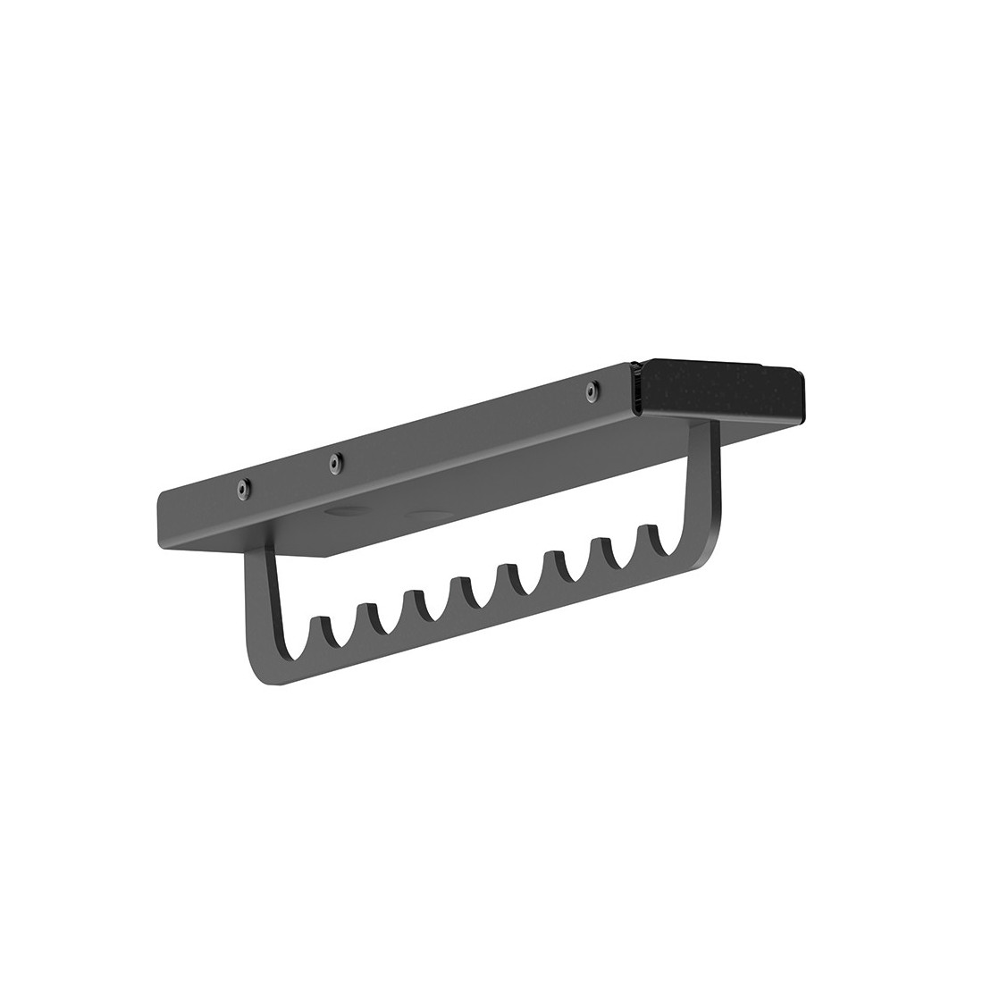 Perchero extraíble para armario fabricado en acero, con acabado antracita y carga máxima de 15 kg. Se monta en el interior del armario para colgar perchas y prendas, con estructura metálica de perfil bajo y brazo abatible.