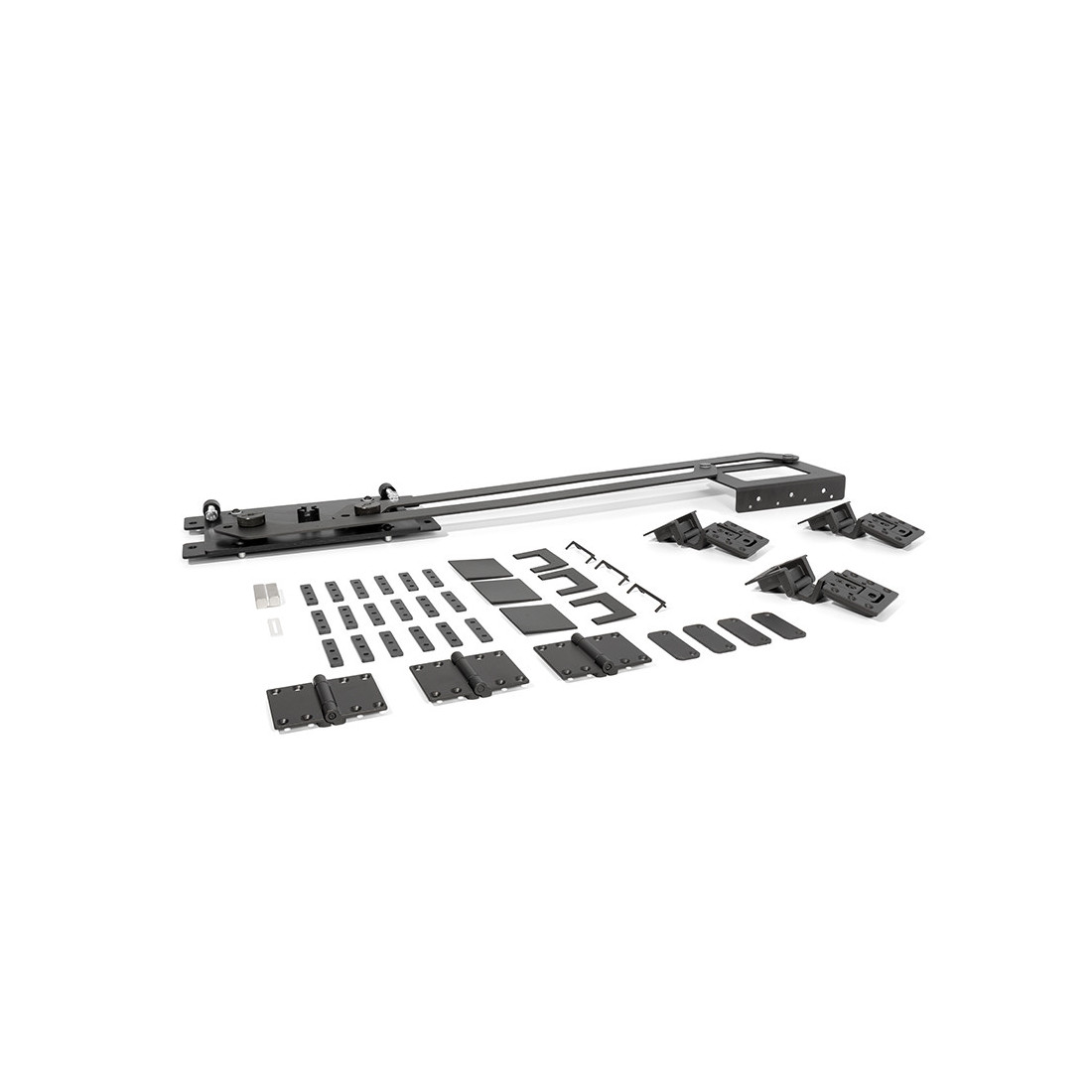 - Contenido del kit: 1 mecanismo + 3 bisagras laterales + 3 bisagras de unión de puertas + tapas embellecedoras (para 1 puerta plegable de 2 hojas).