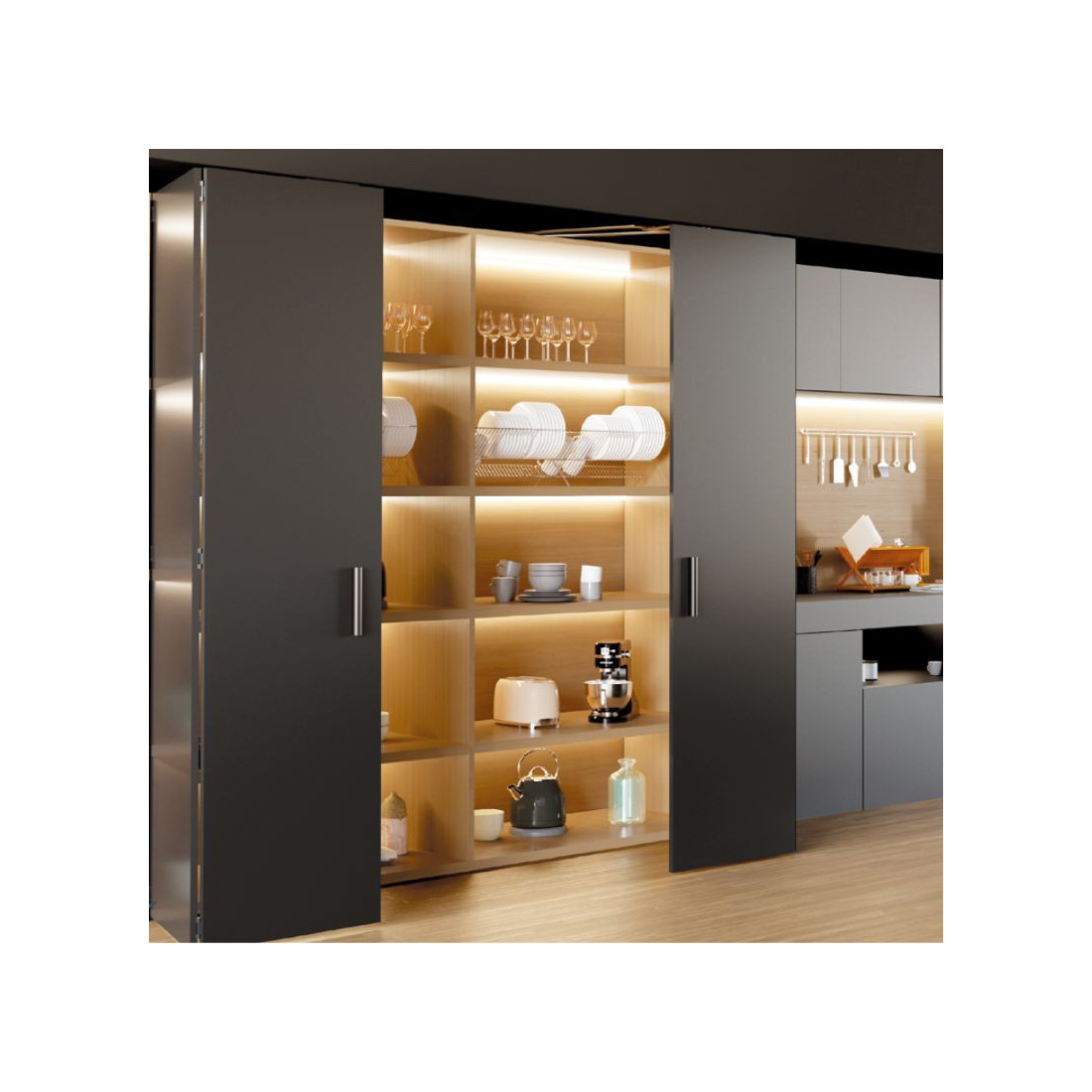 Sirve para crear puertas plegables de armario que se abren por completo y se recogen hacia un lateral, facilitando el acceso a todo el interior del módulo sin que las hojas estorben en el paso.