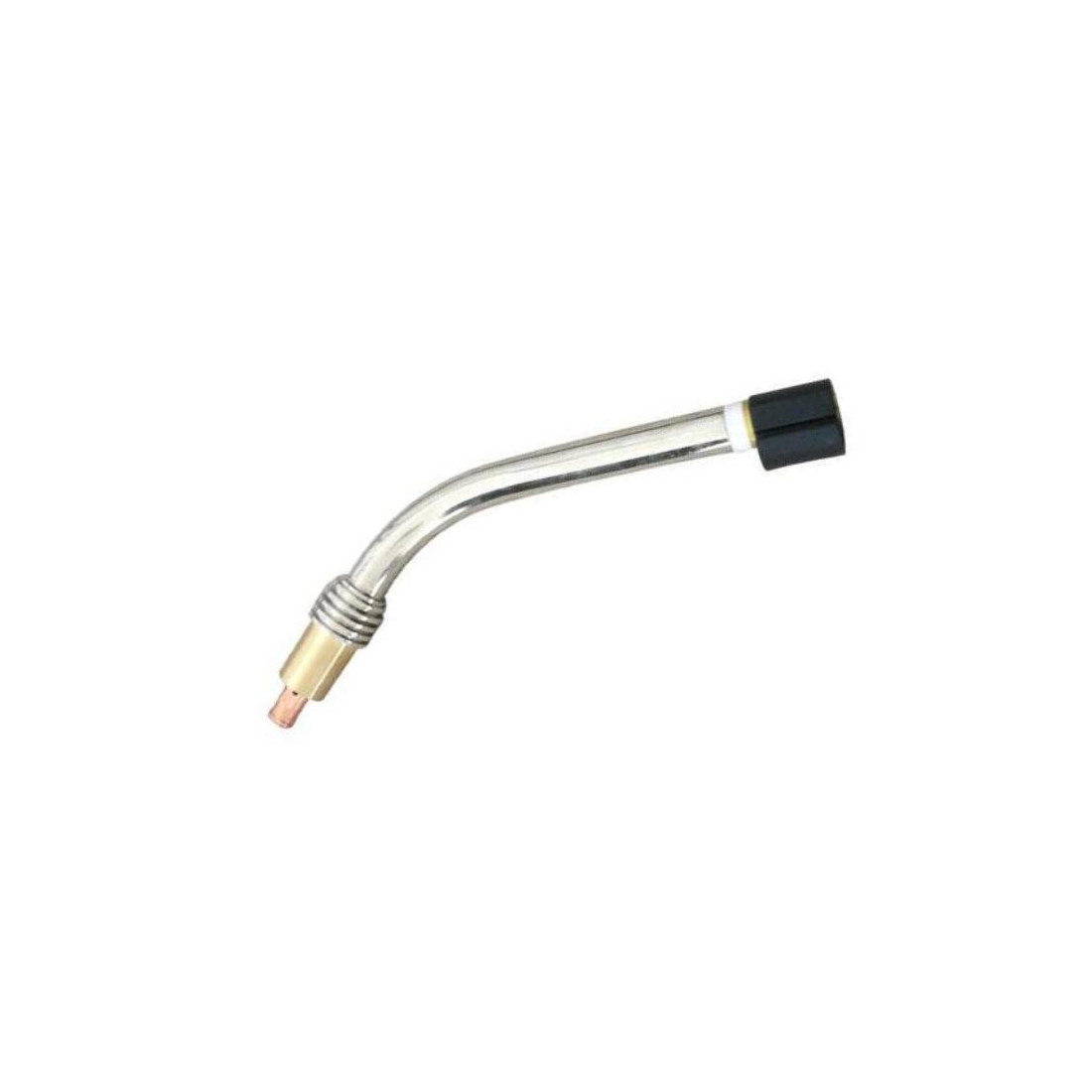 Cuello curvado MB-36 para antorcha TIG con cuerpo metálico, zona roscada de latón y terminal de contacto de cobre. La geometría alargada con curvatura permite orientar la boquilla en trabajos de soldadura TIG donde el acceso frontal es reducido.