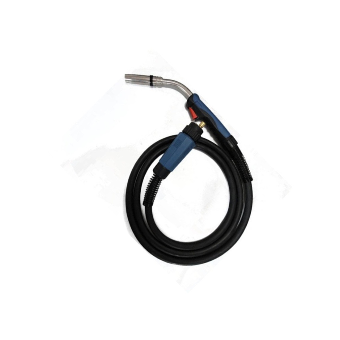 Antorcha de soldadura MIG/MAG MB-36 de 4 m con cuello curvado metálico, cuerpo ergonómico en plástico técnico aislante y conector intermedio con tuerca roscada. Su configuración permite el manejo de un cable flexible de gran sección y una boquilla metálica recta en el extremo.