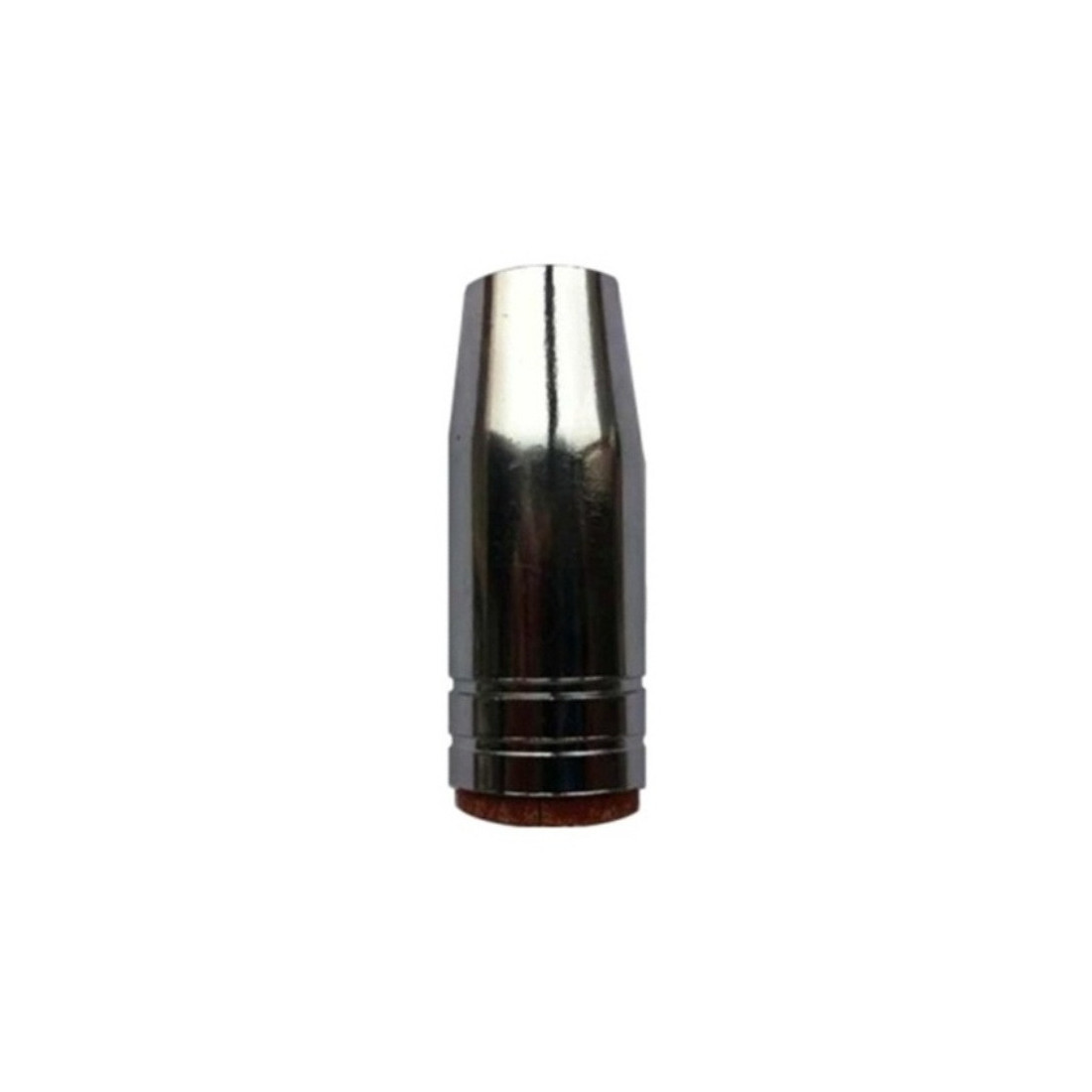 Tobera cónica MB-25 de metal para uso como consumible en antorchas de soldadura. Presenta cuerpo cilíndrico con estrechamiento superior, superficie lisa y acabado brillante tipo cromado o niquelado. La base incorpora ranuras o estrías circulares para ajuste. En el extremo inferior se aprecia un inserto interior de color cobrizo o rojizo.