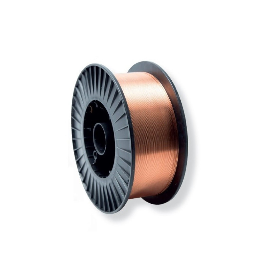 Bobina de hilo de soldar SG2 de 0,8 mm en presentación de 5 kg. El hilo es de cobre y se suministra enrollado sobre carrete plástico negro con geometría cilíndrica y bridas laterales anchas. El núcleo central permite su alojamiento en equipos de alimentación de hilo.