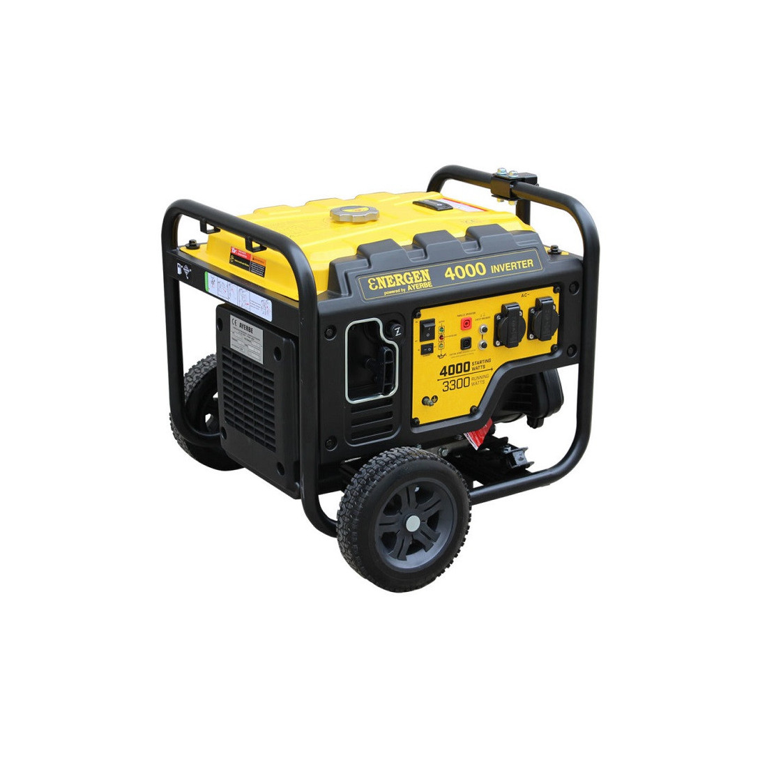 Generador inverter portátil AYERBE ENER-GEN 4000 INV con potencia nominal de 3500 W y potencia máxima de 4000 W. Funciona a 230 V, incorpora arranque manual y utiliza aceite 15W40. Su conjunto incluye carcasa en plástico y metal, estructura tubular perimetral de acero, ruedas de transporte y asas superiores integradas.