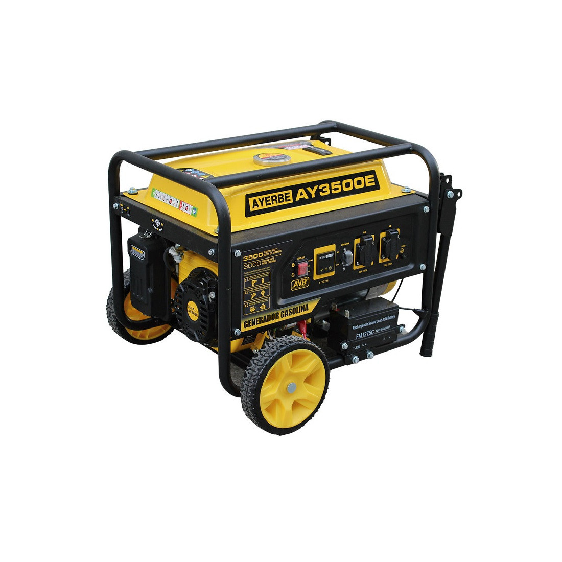 Generador eléctrico portátil a gasolina AY 3500 E con salida de 230 V y 50 Hz, potencia nominal de 3.000 W y potencia máxima de 3.500 W. Incorpora sistema AVR, arranque eléctrico y estructura tubular de acero pintado.