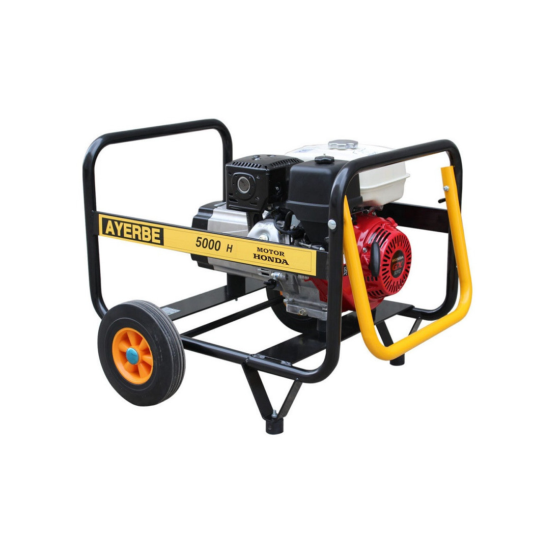Generador de gasolina Ayerbe AY-5000 H MN con motor Honda GX 270, potencia máxima de 5 kVA y bastidor abierto sobre estructura tubular de acero pintado. Incorpora alternador LINZ sin escobillas, arranque manual, depósito de 6 litros y chasis con ruedas de transporte.