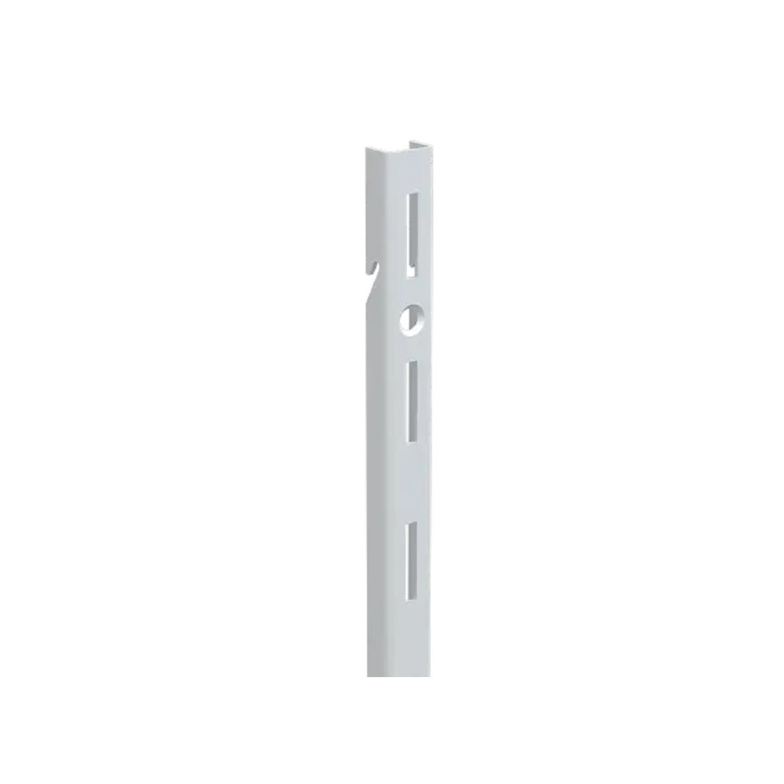 Guía simple sistema Basic de 500 mm en blanco, indicada para formar estructuras de armario y vestidor mediante cartelas, estantes y otros componentes del sistema. La guía se monta en posición vertical u horizontal y dispone de orificios para el encaje de cartelas simples o dobles, así como de estantes y elementos de soporte del conjunto. En este sistema, las cartelas actúan como enganches sobre la guía para crear baldas o estanterías y configurar zonas para ropa u otros usos de organización interior.