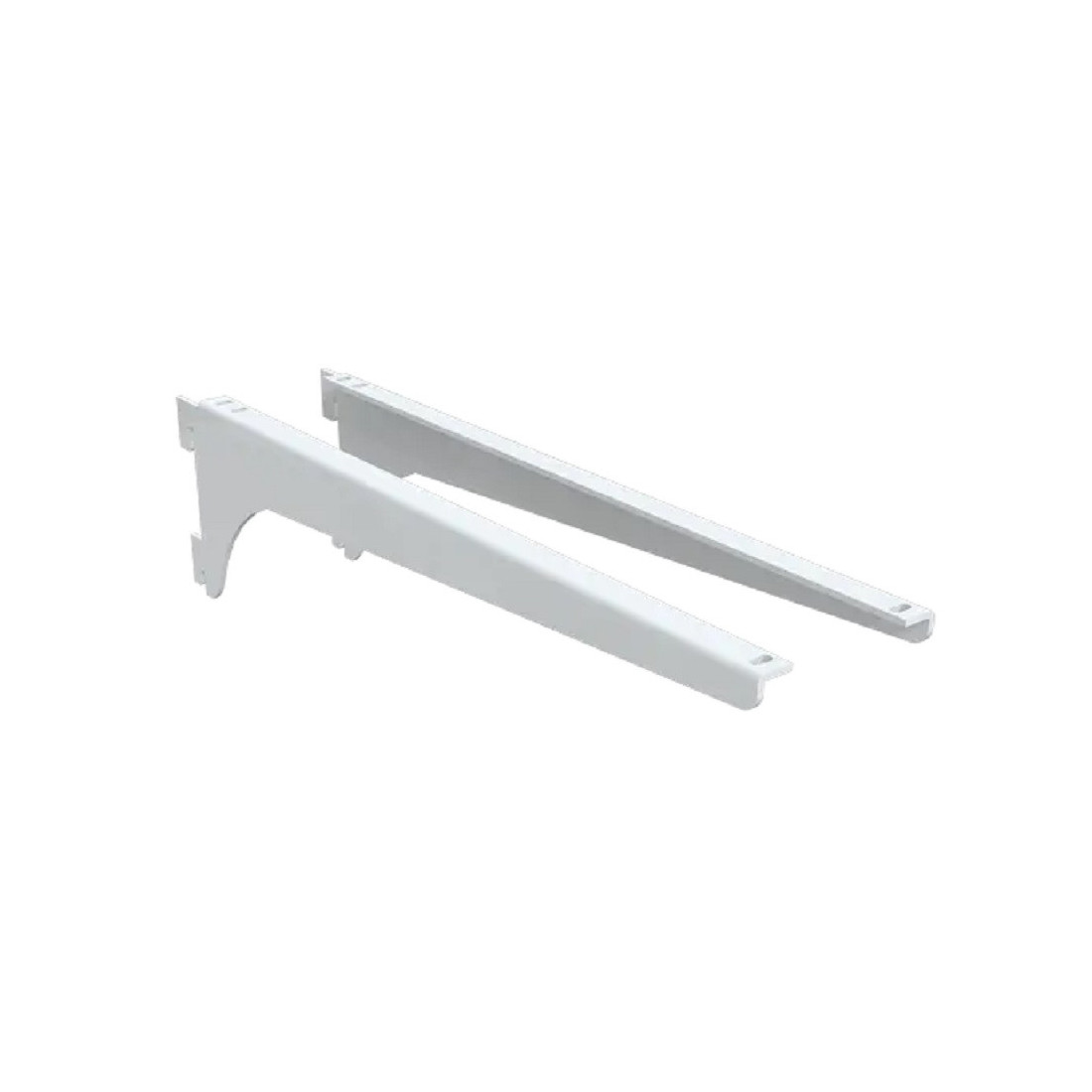 Juego de soporte para sistema Basic de 380 mm en color blanco, formado por piezas metálicas para montaje de módulos de armario, baldas y estanterías dentro del sistema Basic. Se utiliza como guía o soporte de fijación para encajar cartelas, estantes o elementos de organización en posición vertical u horizontal.