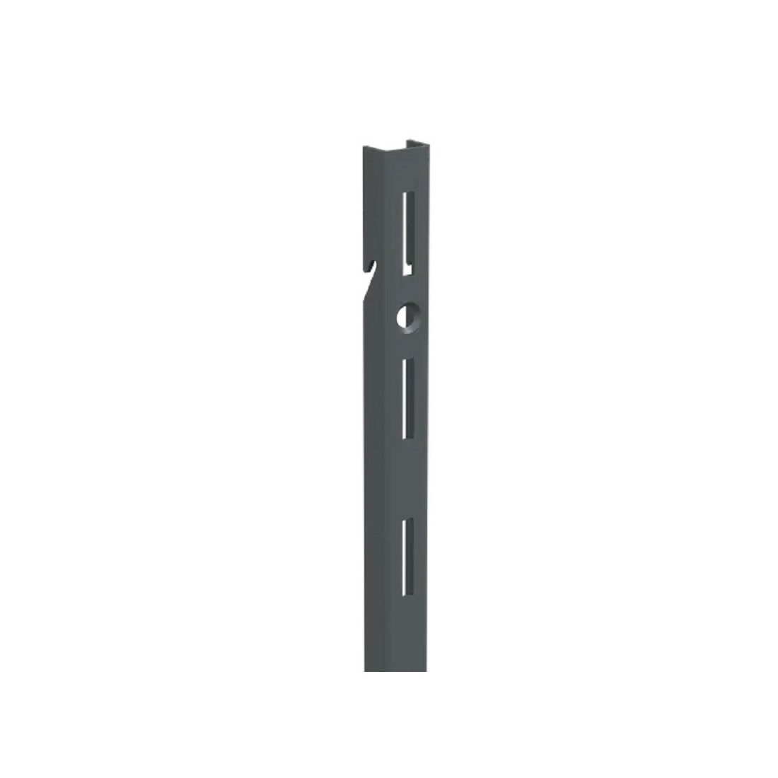 Guía simple Sistema Basic de 2000 mm en acabado antracita para montar armarios y vestidores con elementos encajables del sistema. Puede colocarse en vertical o en horizontal y sirve como base para fijar cartelas simples o dobles, estantes y otros componentes del sistema Basic. El perfil incorpora ranuras de montaje y un orificio central para fijación o ajuste.