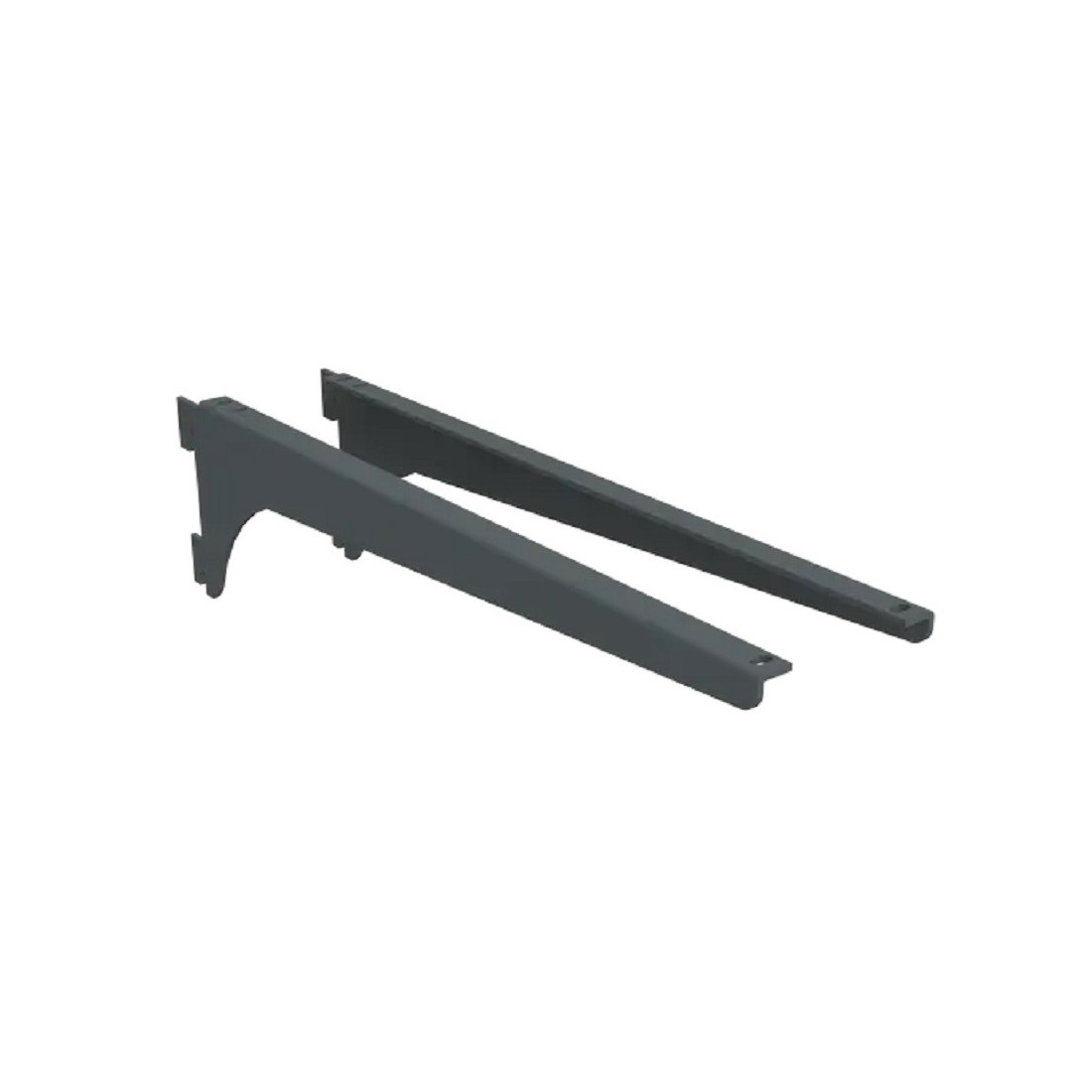 Juego de soporte Basic de 180 mm en acabado antracita para montaje en el sistema Basic de armarios. Se trata de una pareja de soportes metálicos diseñada para trabajar con guías, cartelas y estantes del sistema, tanto en disposición vertical como horizontal según el montaje del conjunto.