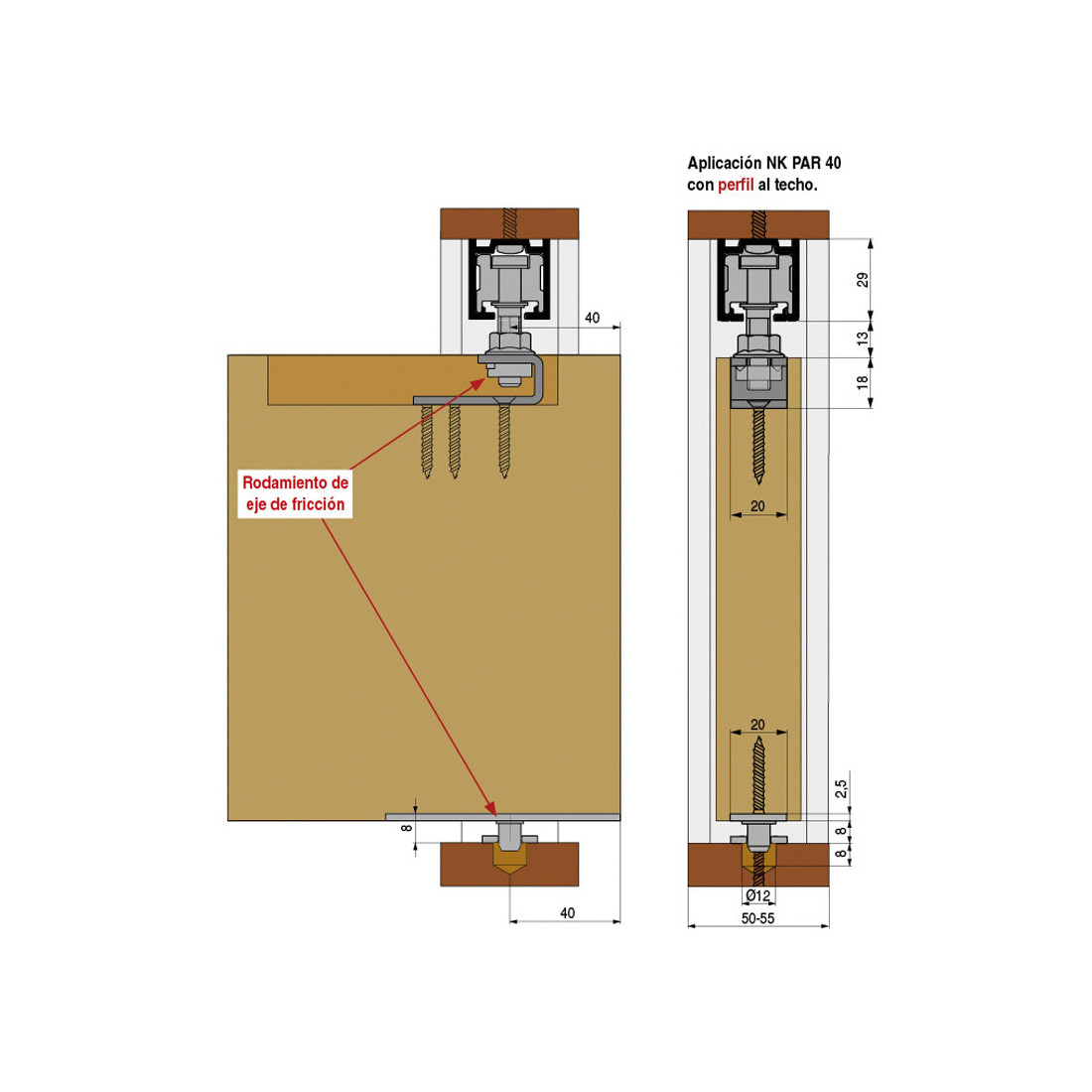 De fácil instalación al techo al utilizar un perfil de aluminio natural, cuyo código es 8014.111; 8014.112. Se recomienda el uso de la bisagra PERSA para obtener un efecto de puerta libro, el código de dicha bisagra es 1109.8.