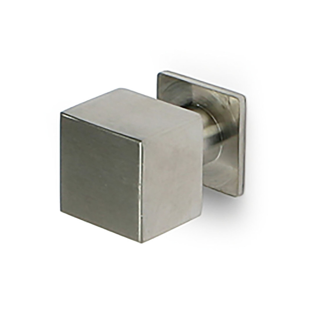 Pomo tirador de acero inoxidable Core 20 mm con forma cúbica, base cuadrada y fijación trasera mediante vástago central. La cara frontal es plana y las aristas están ligeramente redondeadas. El acabado es satinado o cepillado.
