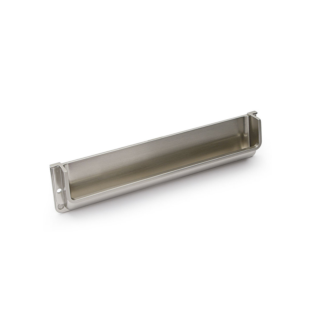 Tirador embutido Nest de zamak para montaje empotrado en puertas y cajones de muebles de cocina, baño, armario o salón. Está disponible en dos fondos para adaptarse a distintas configuraciones de tablero y a instalaciones sin salientes en la superficie.