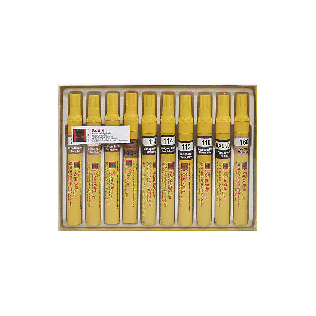 Caja surtido de 10 lápices de retoque para madera en formato lápiz, con cuerpo de plástico y presentación en estuche. Está pensada para aplicar color en superficies de madera mediante un formato de uso manual y punta fina integrada.
