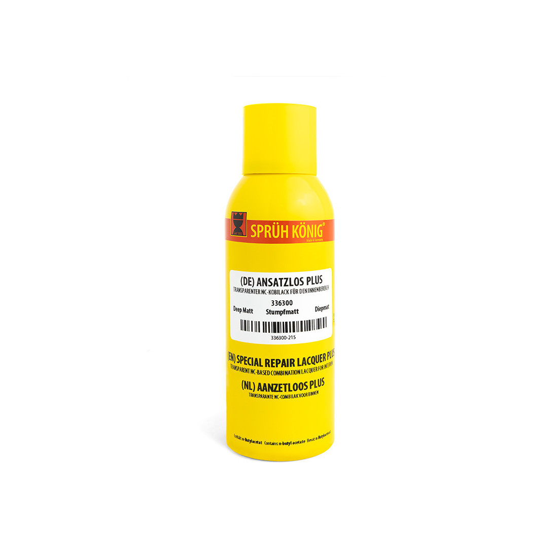 Laca en spray de 150 ml para aplicación por pulverización en interior. Indica base NC y acabado mate intenso deep matt. Se presenta en envase metálico cilíndrico con tapa plástica de protección.