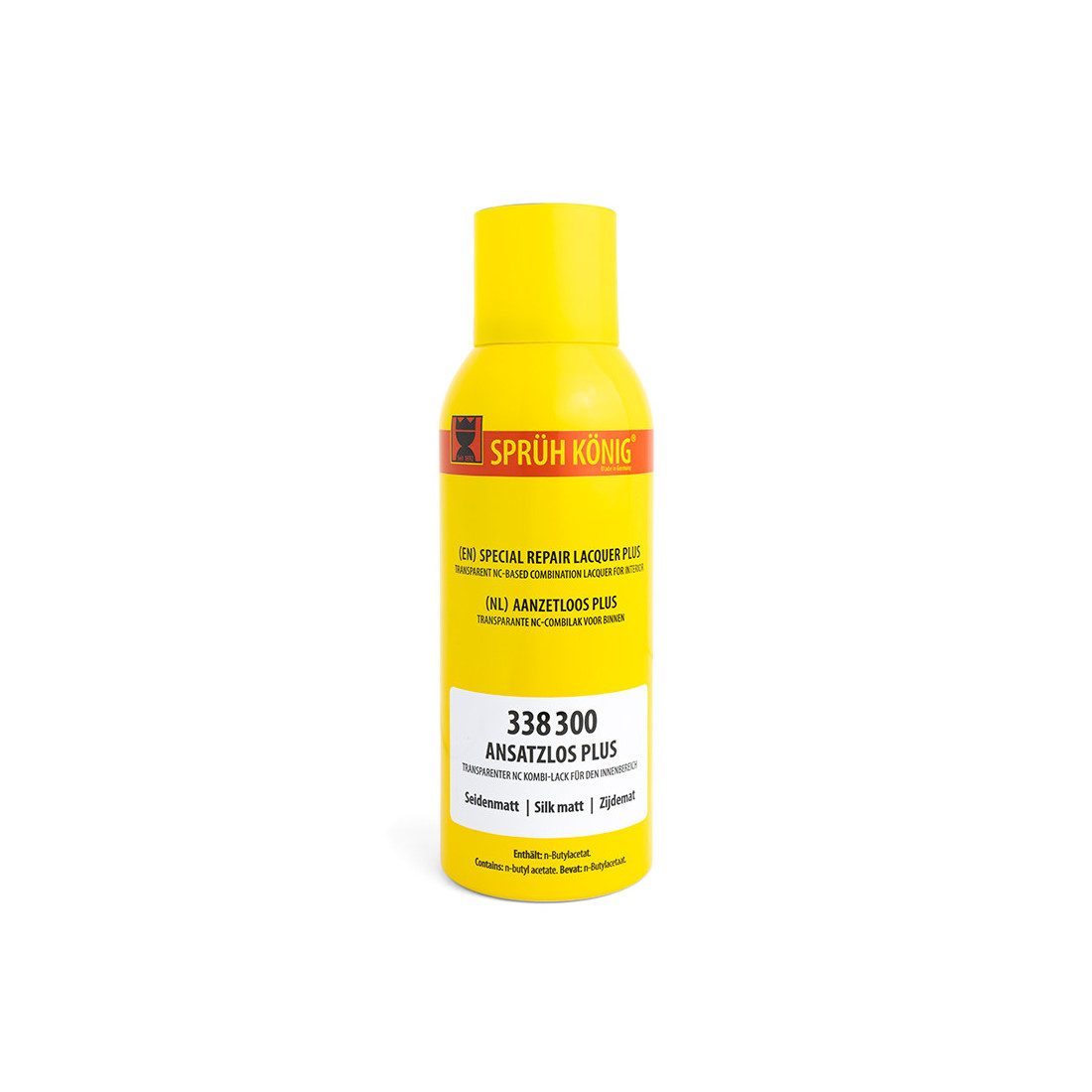 Spray laca de fijación semimate 150 ml en formato aerosol para retoque y reparación de superficies. El envase es de plástico y contiene 150 ml. El acabado indicado es satinado / silk matt. La referencia comercial es Sprüh König.
