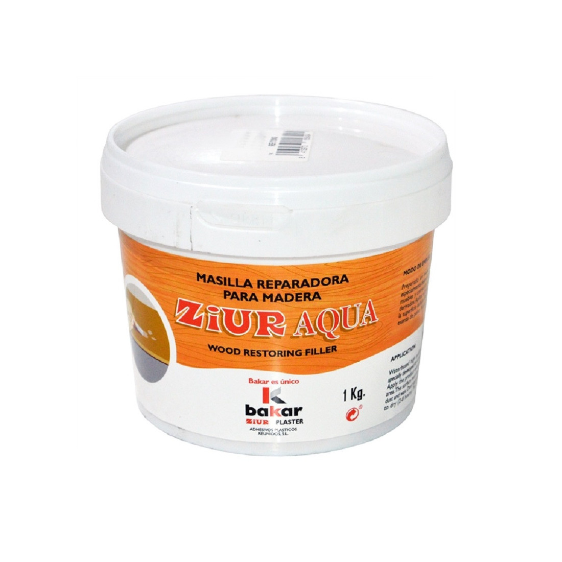 Masilla para madera Ziur Aqua natural 1 kg para relleno y restauración de superficies de madera. Se presenta en formato de 1 kg y en envase plástico tipo cubo con tapa a presión.